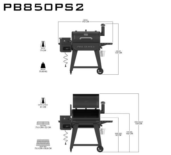 The PB850PS2 Wood Pellet Grill has an 5,484 square centimeter cooking
